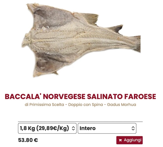 na talijanskoj stranici za on-line prodaju delicija Distinti Salumi, jedan dio je posvećen bakalaru, kako suhom norveškom, tako i soljenom norveškom i islandskom.