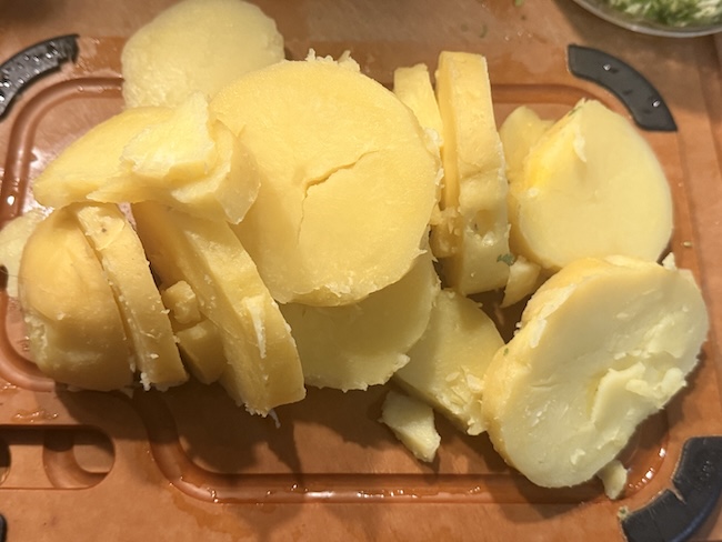 2. Krumpir skuhati u kori (u ekspres loncu kada prosvira 5 minuta), toguliti i narezati na ploške.