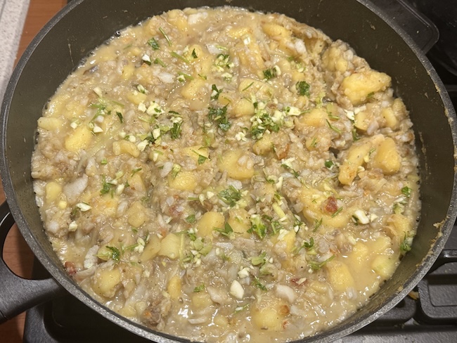 3. Dodati krumpir, pa malo ga razmrviti zajedno s fileima bakalara. Blago podlijevati bijelim vinom i strugati sa dna, kako bi svi ukusi ostali u jelu.