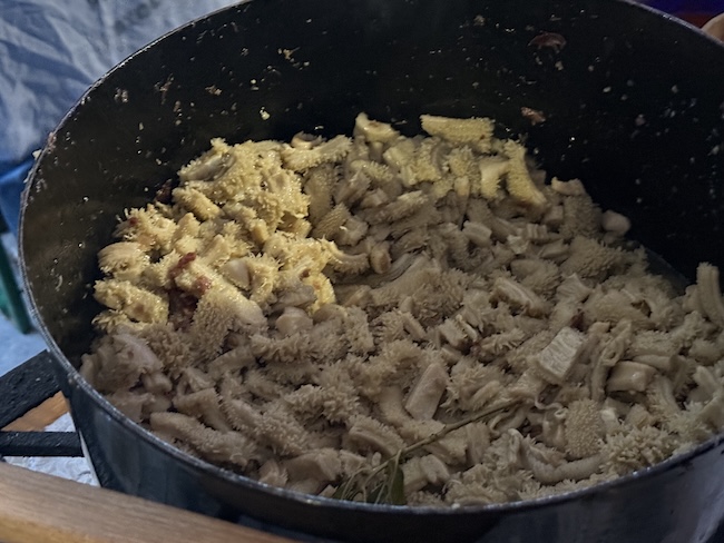 Prava dalmatinska ekipa. Muški sjede (a jedan od njih ima i zanimljivu pregaću), a jedina žena radi i miješa tripice. Krumpiri samo što se nisu dodali. Naglasili su da u njihovim tripicama ima 31 različiti sastojak uključujući masline i kapare. Izgleda da su čitali kultnu kuharicu Dalmatinska kuhinja Alda Ivaniševića koju smo prije spominjali.