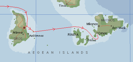 Od Syrosa do Mykonosa nije daleko... a i smjer meltemija je povoljan: bočni. Oprezan valja biti tek na kraju, u dosta uskom prolazu gdje meltemi dodatno pojačava.