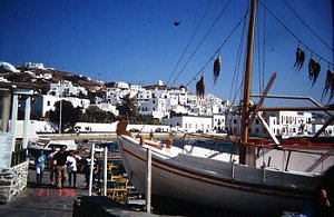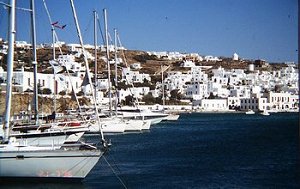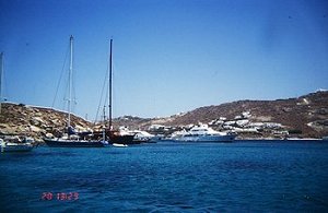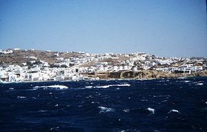 Svaka zemlja, a naročito turistička, ima neko svoje mjesto koje je turistički SIMBOLIZIRA. U Hrvatskoj je to nesumnjivo DUBROVNIK. A u Grčkoj? MIKONOS! I tako smo mi odlučili još za vrijeme priprema, da će nam krajnji cilj naše prve grčke traversade biti upravo Mikonos. Nakon što smo se temeljito odmorili na posljednjem našem sidrištu (ispred Syrosa, u zavjetrini otočića Gaidarosa), navukli smo svoja nepropusna žuta odijela od 20.- DM (!) i hrabro se bacili u MELTEMI koji je tog dana, kao za vraga, odlučio pokazati što zna i može ! Unatoč visokoj sezoni - putem nismo vidjeli niti jedno drugo jedro; svi ostali bili su pametniji od nas i "jedrili" su po tavernama okolnih otoka...