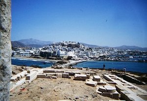Pogled od kamenih vrata prema mjestu Naxos. Desno je sidrište; iza njega velika gradska luka. Naxos obiluje plažama; omiljen je medu turistima. |