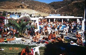 I zaista - smjestivši se dan kasnije u izuzetno sigurnoj luci IOSA , popeli smo se do samog mjesta, iznad luke, gore medu bregovima... i doživjeli šok: stvarno, osim moje malenkosti nije bilo zavidjeti nikog starijeg od 30 g.! Dok u MIKONOSU cvate turizam svih generacija (i "svih spolova"), na IOSU borave samo zdravi, mladi i normalni! Mariu, vec mjesec dana bez ženskog društva, gotovo je pozlilo: toliko "komada" na hrpi... otkačenih, komunikativnih, razdraganih, suncem opaljenih, lijepih, mladih, dobro građenih... IOS zbog vrste svojih gostiju živi svojim ritmom: prije podne se budi; oko podneva se ustaje; popodne odlazi do plaže i sportsko-zabavnog centra uz nju, slijedi kratki shoping i odmor pred izlazak oko ponoći!