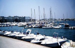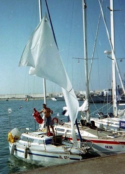 Otrant; sušenje jedara. I gle: kraj nas je jedrilica iz Crikvenice čiji skiper je već nekoliko dana ovdje, čekajući da snaga sjeverozapadnjaka padne, da bi se mogao vratiti! |