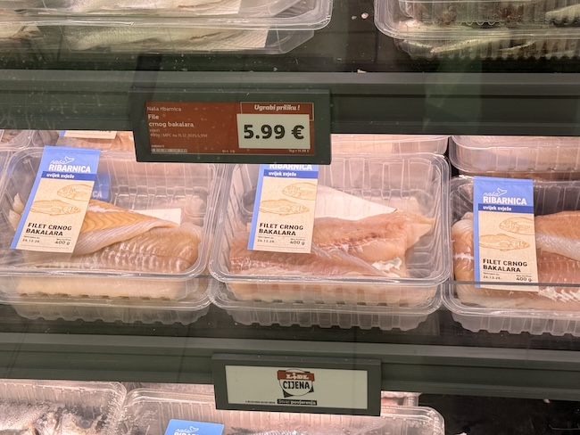 U hrvatskoj crni bakalar možete kupiti duboko smrznutri (filei Ledo crnog bakalara su skoro u svim trgovačkim lancima za ovaj božić prigodno 17,5 EUR/kg, filei Ocean crnog bakalara su oko 20 EUR/kg, filei Spar crnog bakalara su u Intersparu 11 EUR/kg koliko dođu i u Eurospinu >>> KATALOZI). Svježi crni bakalar je nešto jeftiniji - trenutno ga ima samo u Lidlu po cca. 15 EUR/kg.