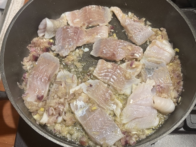 1. Zažutiti crveni luk (posoljen) na maslinovom ulju dok ne porumeni, pa dodati poriluk i kratko zapržiti komede filea crnog bakalara debele 3 prsta. Porulik daje dodatnu slatkoću.