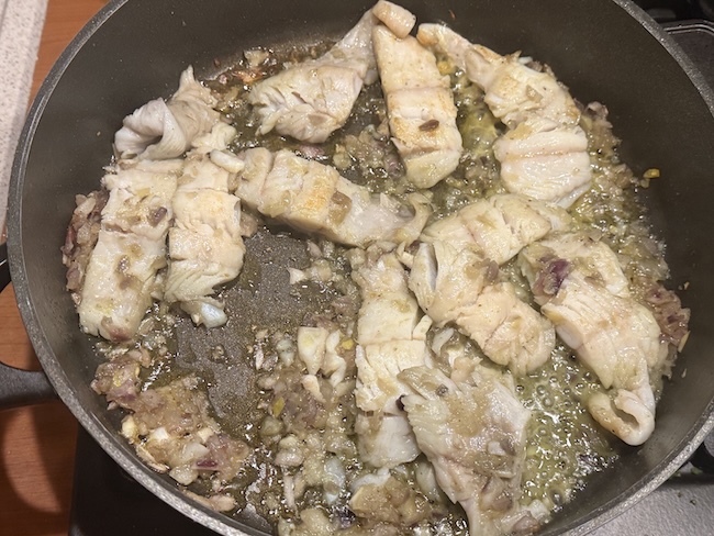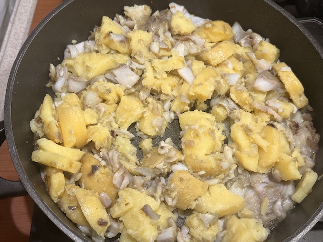 3. Dodati krumpir, pa malo ga razmrviti zajedno s fileima bakalara. Blago podlijevati bijelim vinom i strugati sa dna, kako bi svi ukusi ostali u jelu.