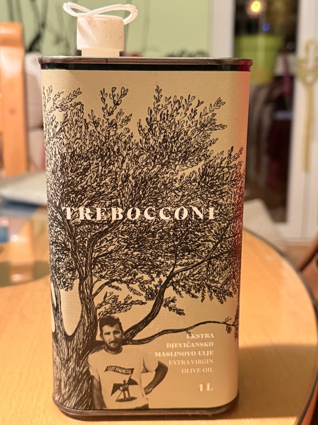 ali za konačno završno poškropljenje to je ipak bilo domaće, tribunjsko maslinovo ulje Trebocconi proizvodnje OPG Stipaničev. Ono je previše dobro da bi se s njim pržilo, ali zato dodano na kraju bez termičke obrade daje završni okus.