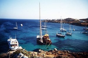 Sidrište Ormos Ornos, u zavjetrini krajnjeg otocnog rta. Na slici se vidi tek dio velike uvale. Glavnina brodovlja je lijevo, izvan vidnog polja... |