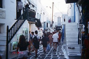 Kad upoznate MIKONOS, prvo dobijete potrebu da nazovete našeg aktualnog ministra turizma i pozovete ga ovamo da vidi kako treba izgledati taj "turizam"... MIKONOS nema ništa što nemamo i mi, što više, Jadran je još ljepši od grčkih mora. Mjesta su nam, u biti slična. Grčka mjesna infrastruktura je skromna. Nema nikakvih basnoslovnih atrakcija. Grčka na Cikladama ima samo svoje prekrasne, blistavo bijele i nevjerojatno čiste gradiće s karakterističnom kockastom arhitekturom i svoje marljive, nevjerojatno srdačne stanovnike, kojima je turist stvarno najdraži gost, a ne antipatični, glupi furešt, kao kod nas. Mikonos je perjanica otočkog turizma. Cijeli je pretvoren u turizam. Sve uličice cijeloga gradića su turizam. Gdje žive i spavaju mještani - nije jasno, jer doslovce svaka kuća u prizemlju ima neki lokalčić ili dučančić, a na katu su sobe za iznajmljivanje. Ipak, i tako 100% ponuđen turistima, dupkom je pun; mjesta nema "ni za lijek"! Pritisak turista je tolik da mnogi spavaju u vrećama na pijesku plaže, čekajući da im se nekim čudom pronađe slobodni krevet !