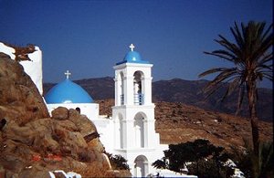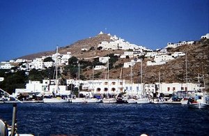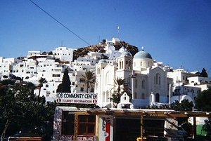 Na svim otocima Ciklada samo su luke dolje; mjesto se naziva "Chora" i od starine je povučeno gore, u brda. (Razlog: gusari!) Mladenački Ios stoga sav živi gore, u Chori, a dolje ide samo na kupanje... |