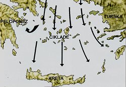Tajna jedrenja Cikladama: uvijek u smjeru kazaljki sata ! "Popuštanje" Meltemiju, a vraćanje natrag (debela strelica) uz rubove Peloponeza, gdje vjetra gotovo nema ! Probiti se kroz Meltemi na sjever, direktno - nemoguće je. (3 put probali i - odustali) |
